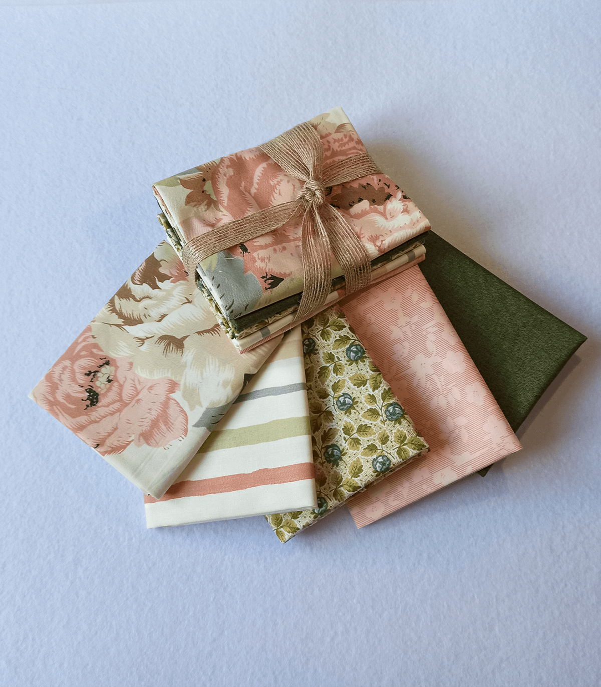 Pack de 5 Fat Quarter en colores salmón, verde y estampado de flores y rayas. Aquí tienes una bonita combinación de telas para realizar cualquier proyecto de patchwork.