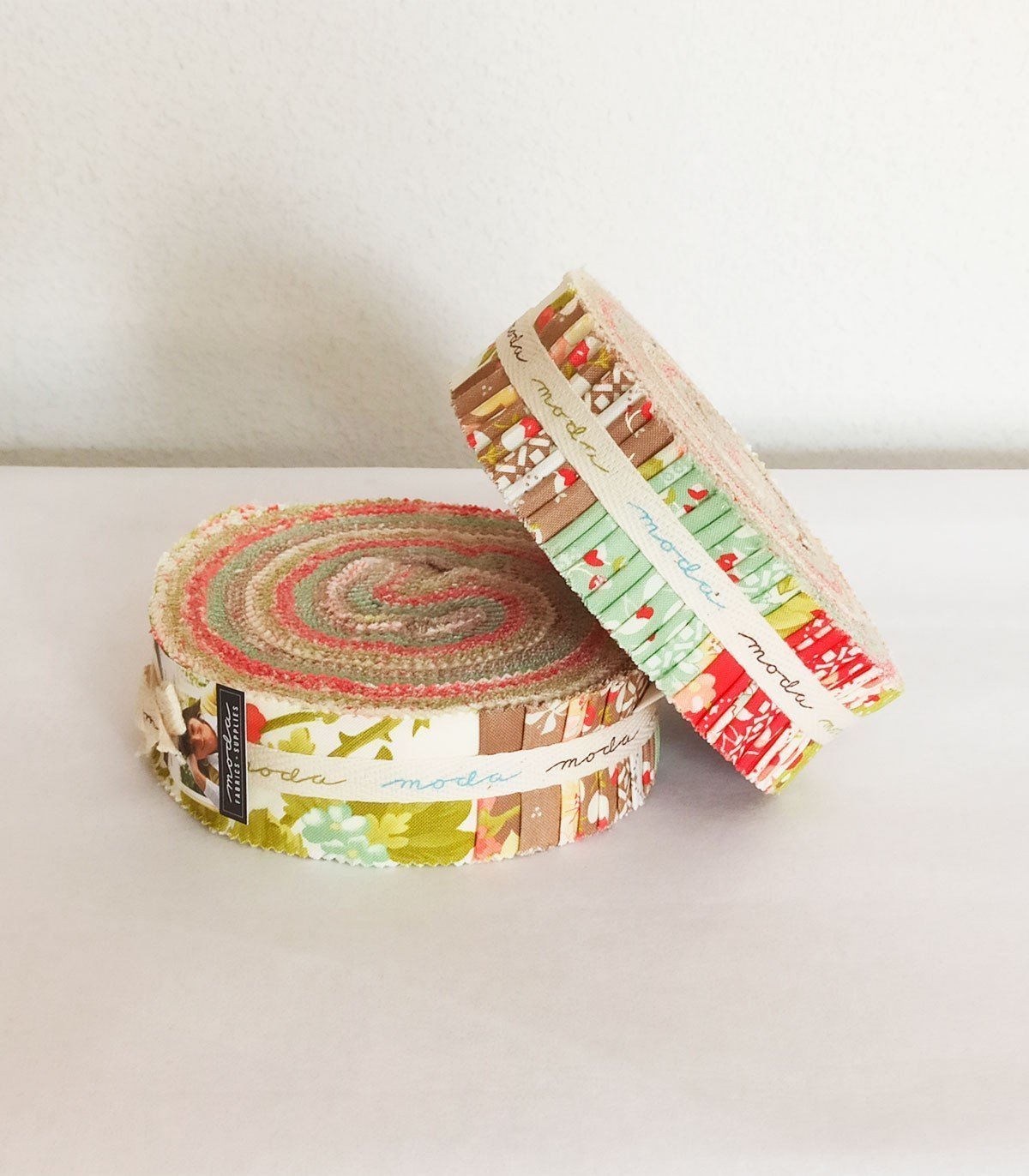 Precortado de Moda Fabrics que incluye las 42 telas de la colección, cortadas con laser, en tonos verdes, marrones, corales y beige.