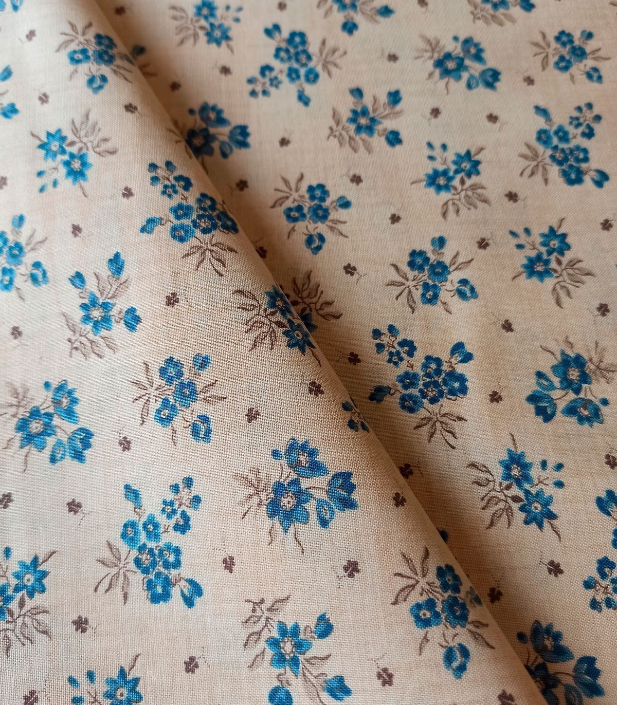 Tela con fondo beige y ramitos de flores en azul de la colección Marias Sky para Moda Fabrics. Simplemente ideal !!